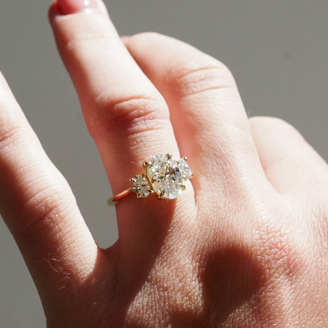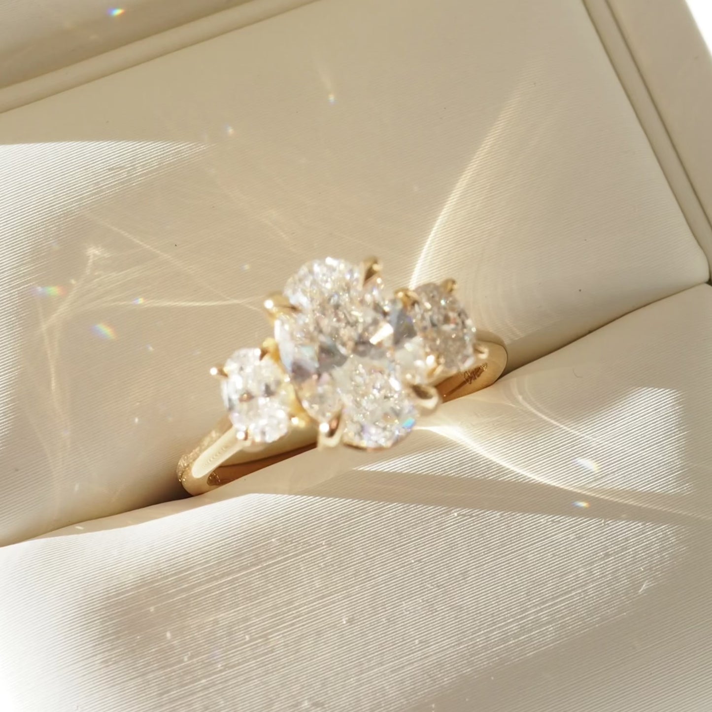 Our Ava ring showcases a brilliant 2.03ct oval cut lab-grown centre stone shining between two smaller-sized 0.25ct shoulder lab-grown diamonds.