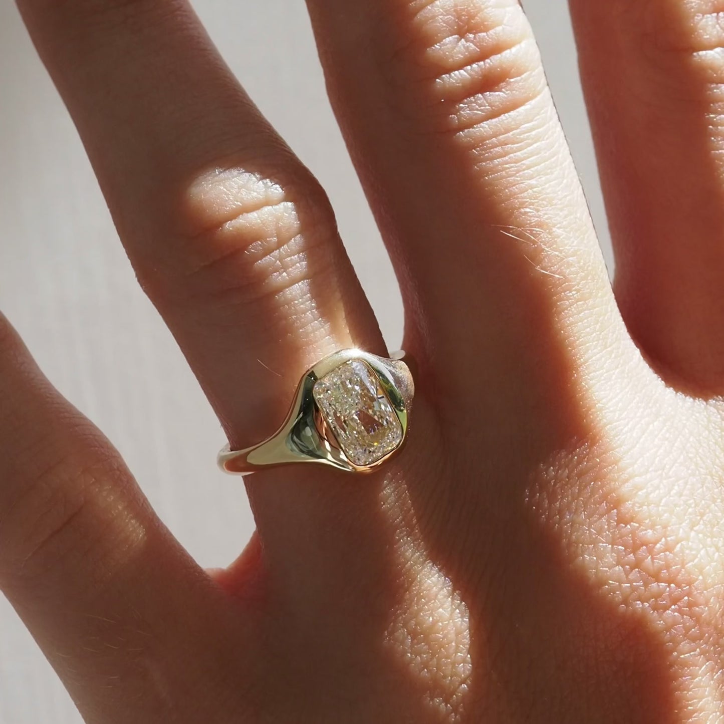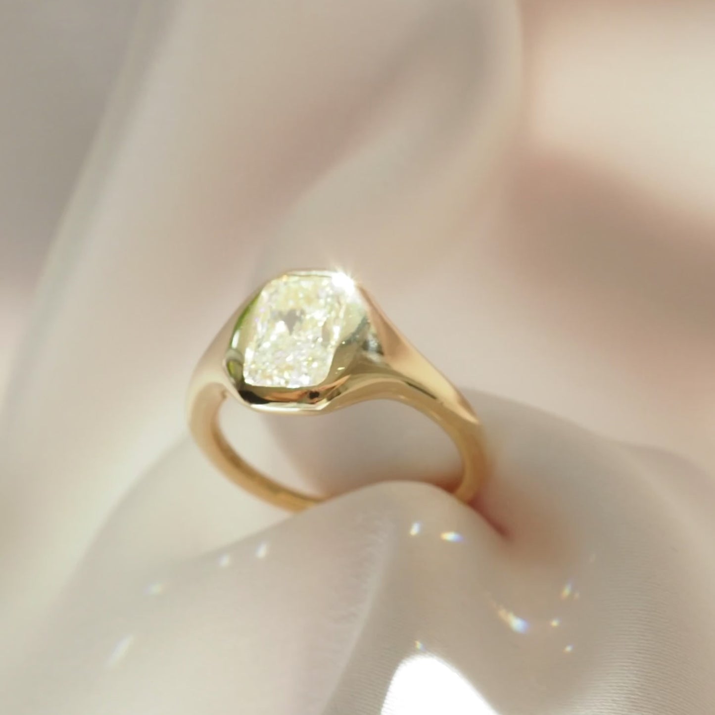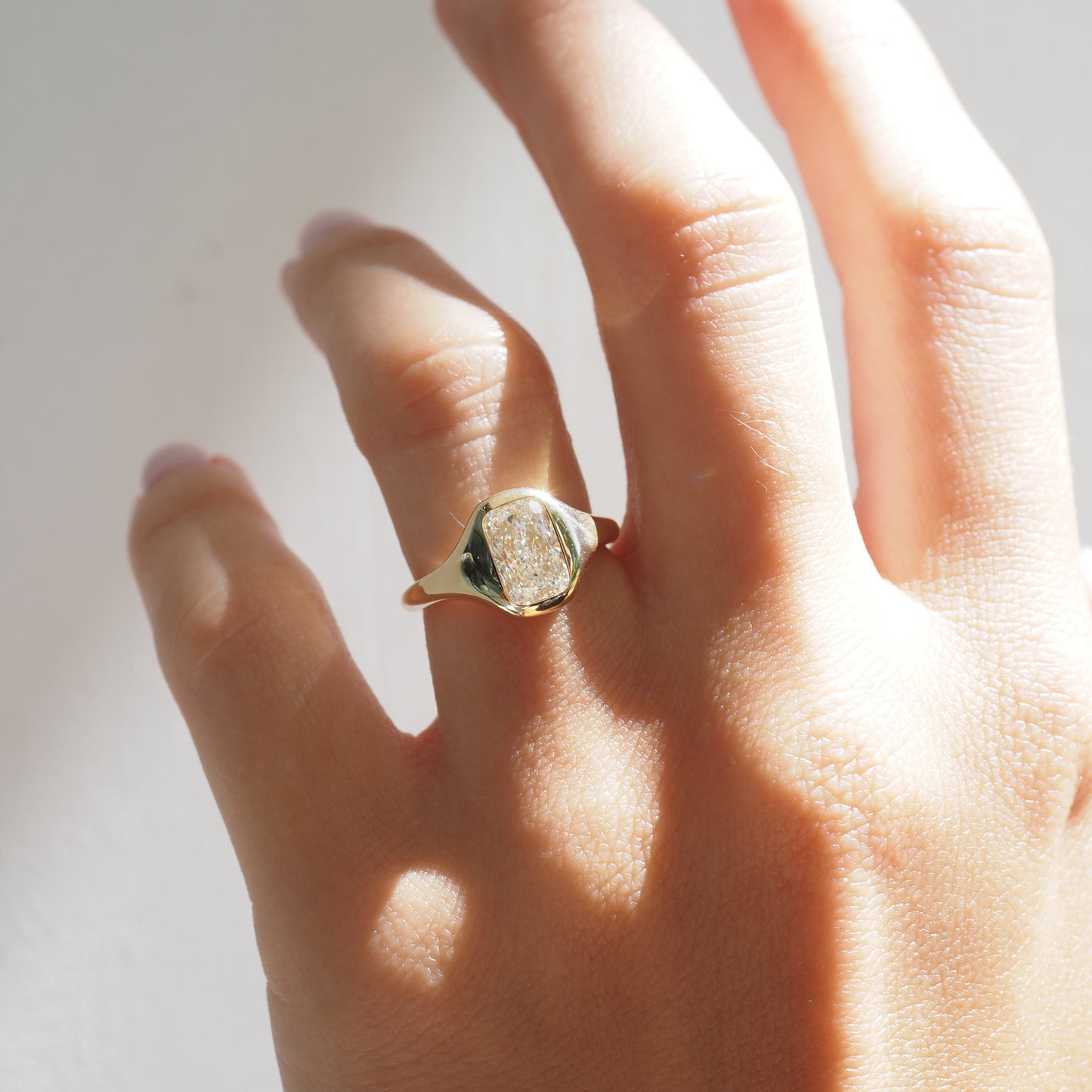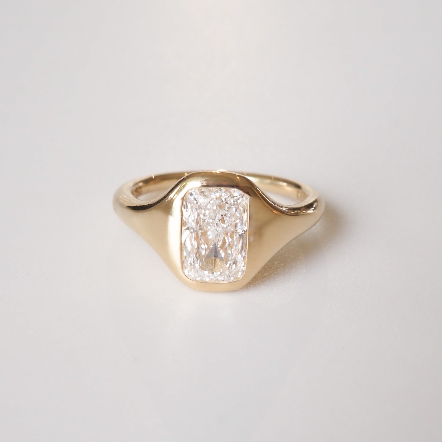 A modern signet, softly sculpting the silhouette of an elongated cushion lab-grown diamond— ready to wear