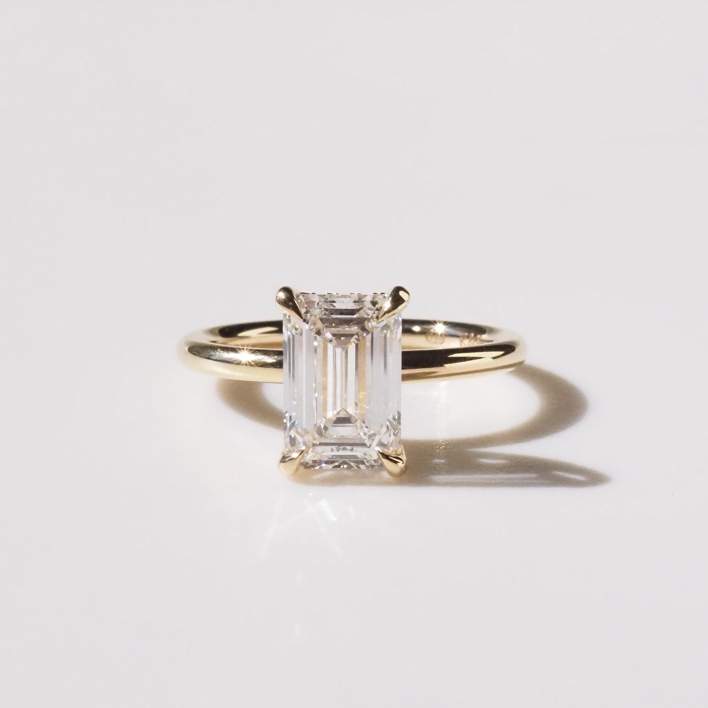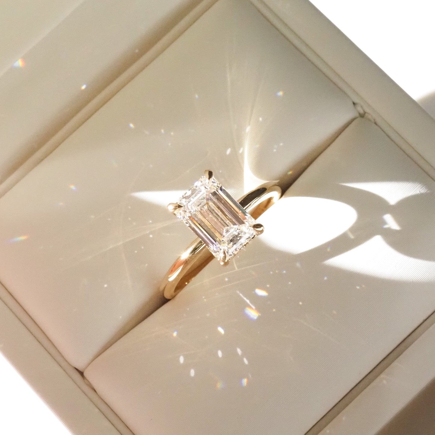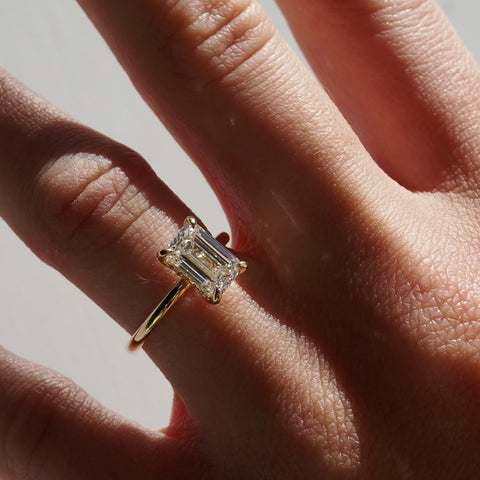 Our Eva engagement ring features a 2.04ct emerald cut lab-grown diamond held within a simple four-talon claw setting with hidden halo.