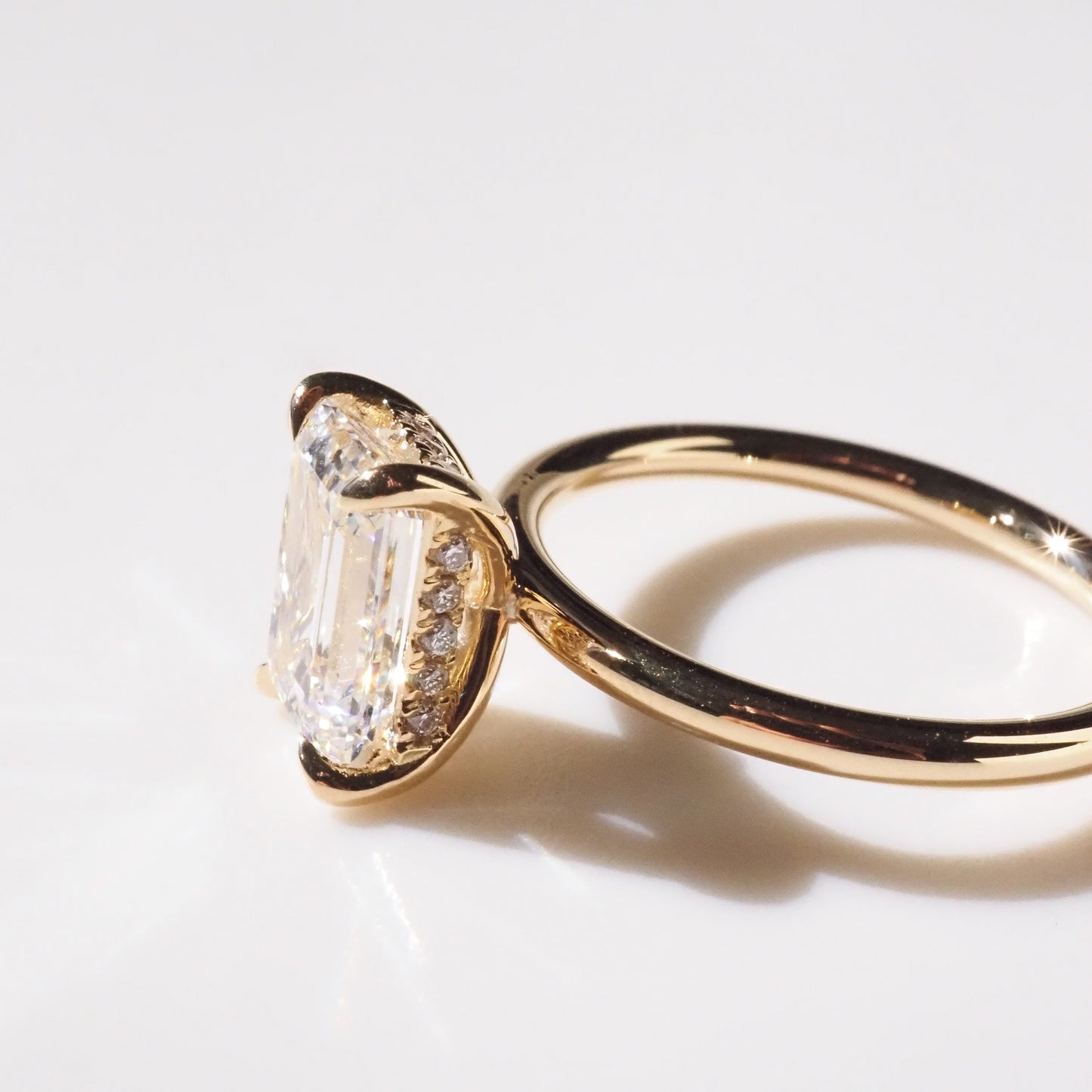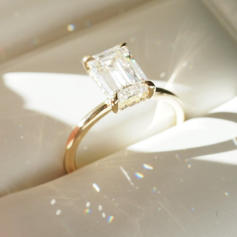 Our classic emerald lab-grown diamond engagement ring featuring a hidden halo—ready to wear