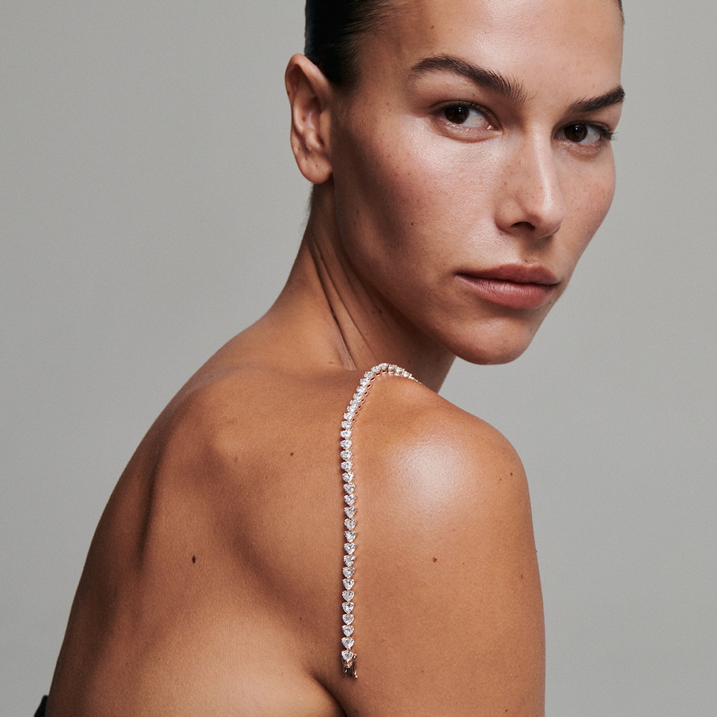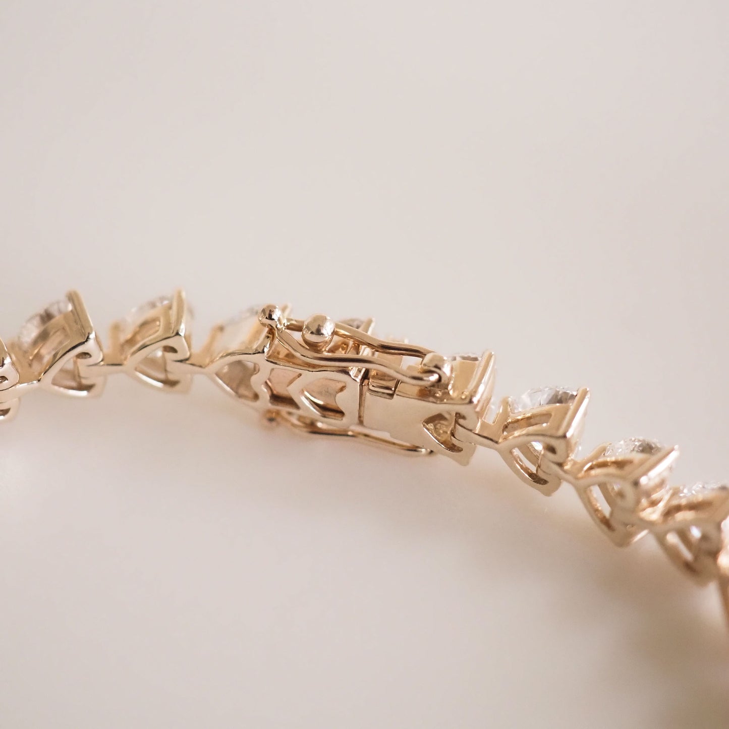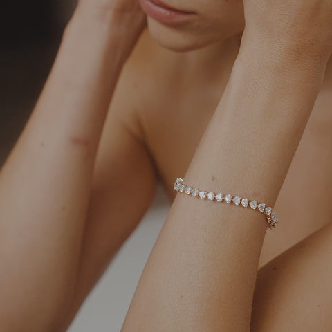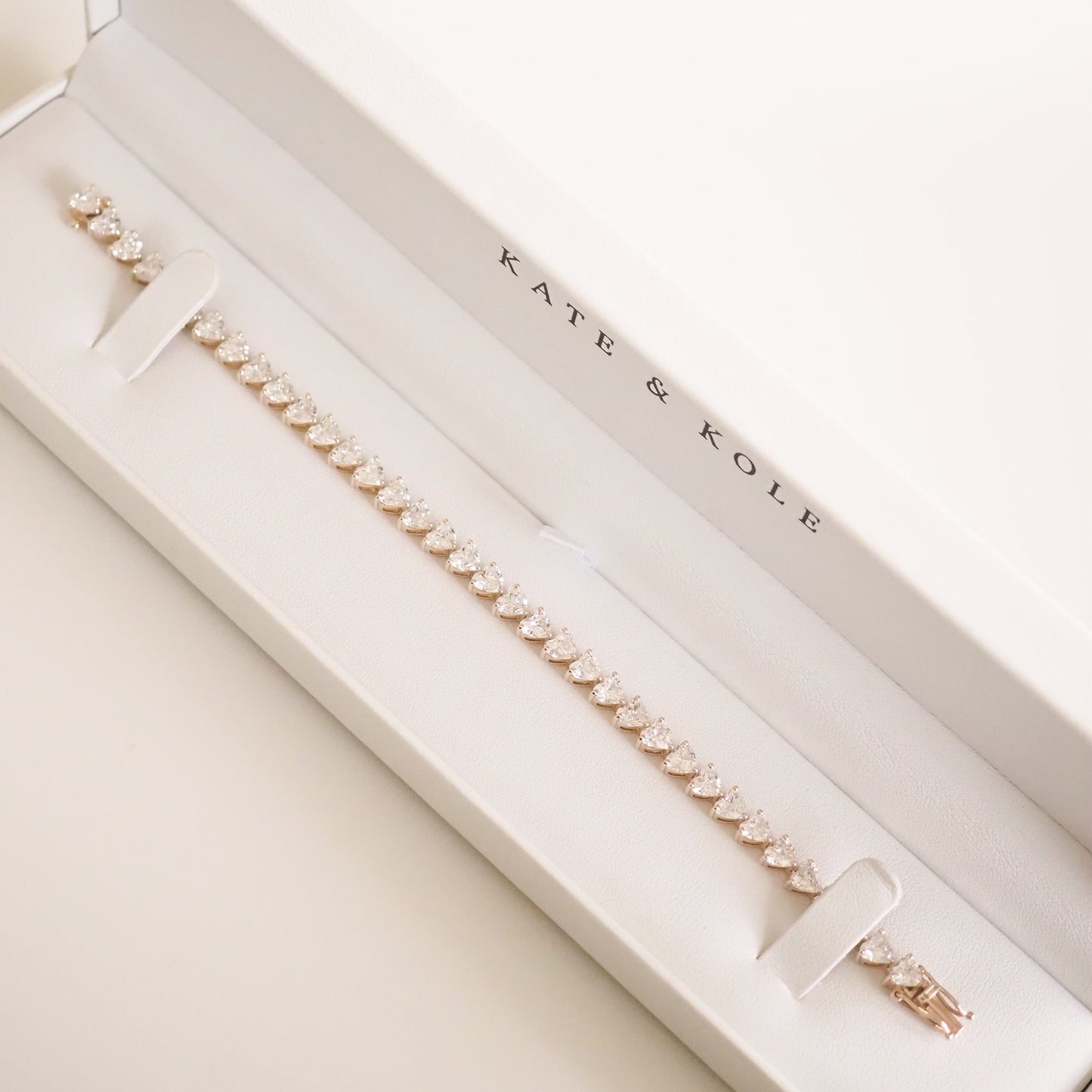 A delicate line of heart-cut lab-grown diamonds set in gold—a modern, romantic take on the classic tennis bracelet