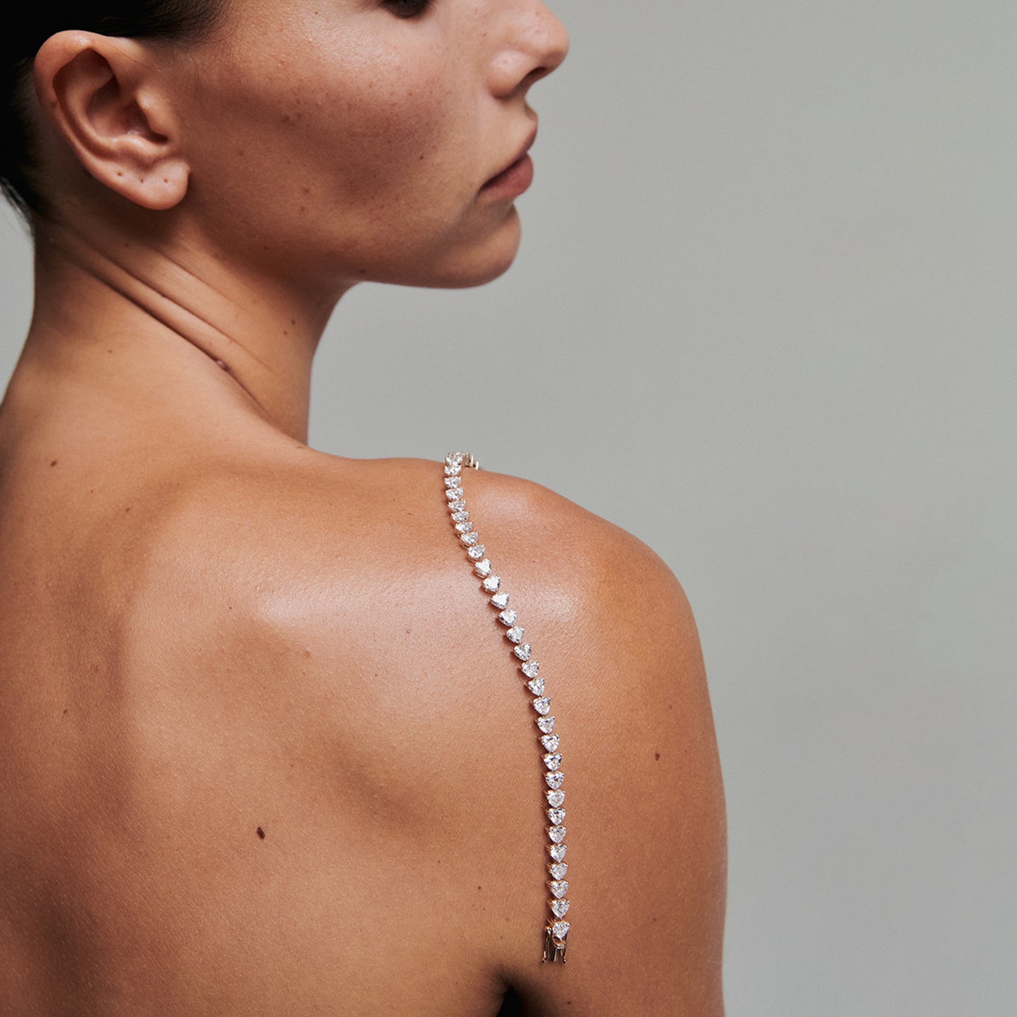 A romantic reimagining of the classic tennis bracelet, this design features a continuous line of heart-cut lab-grown diamonds set in gold or platinum. Each stone is delicately secured in a custom setting that celebrates the unique shape and brilliance of the heart silhouette — a timeless symbol of love and connection. Designed to sit comfortably against the wrist, this bracelet brings a modern heirloom feel to any moment worth remembering.