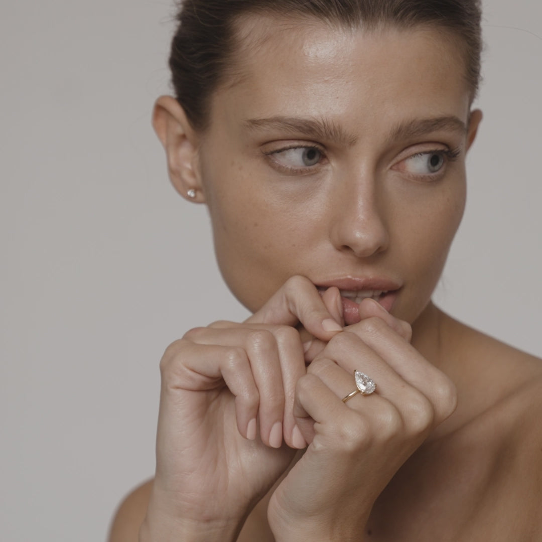 An internally flawless Pear Lab-Grown Diamond Engagement Ring—ready to wear