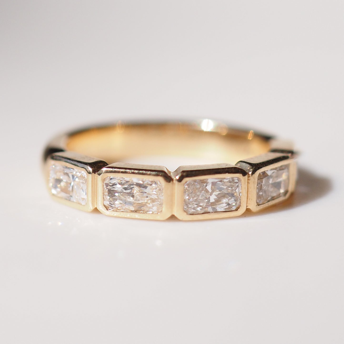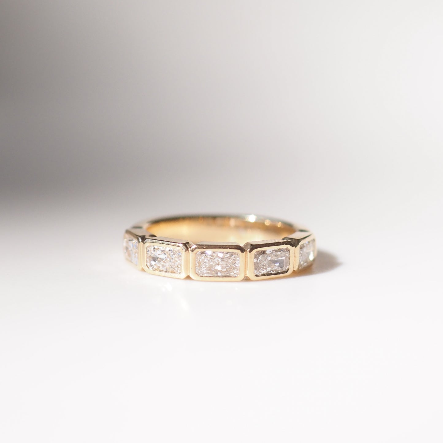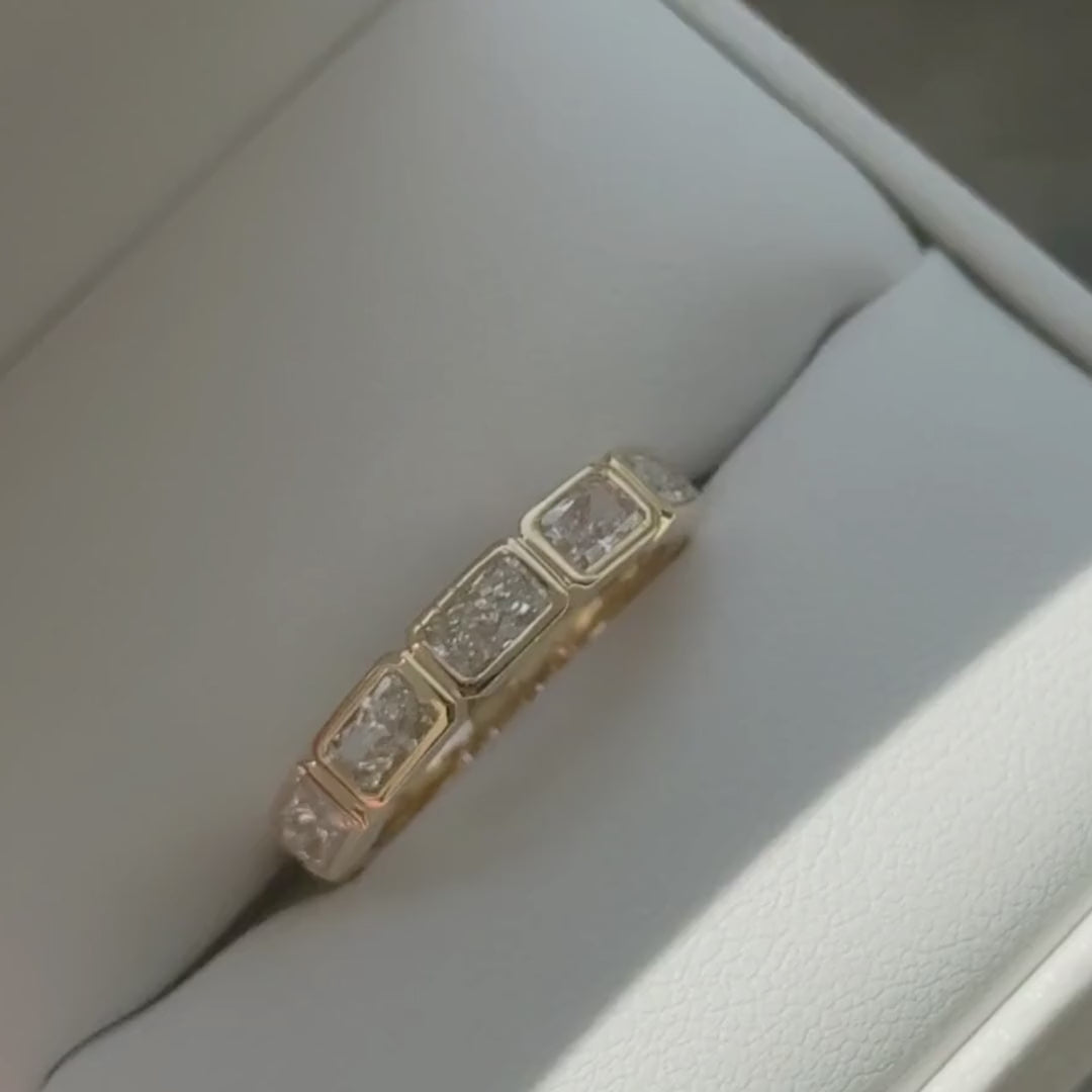 A modern take on timeless elegance — Rivi features a bezel-set design of five radiant cut lab-grown diamonds