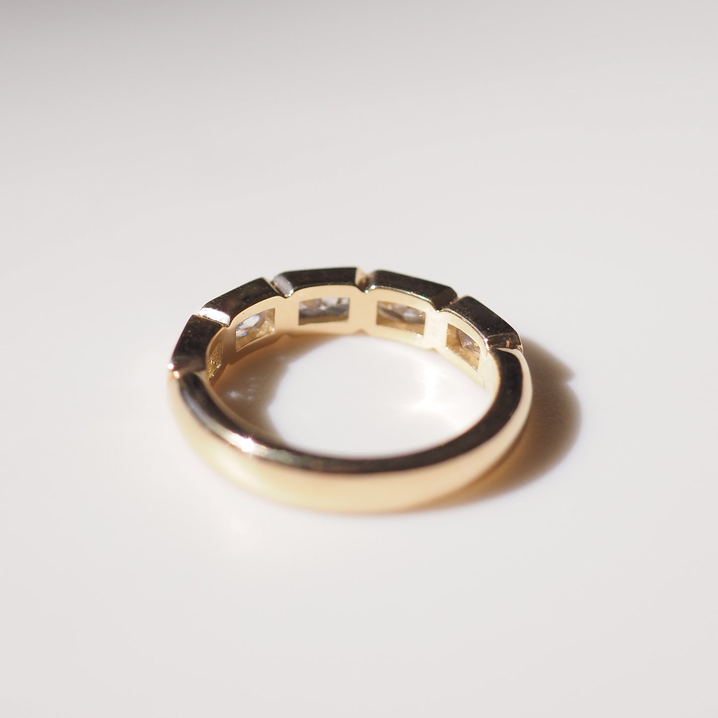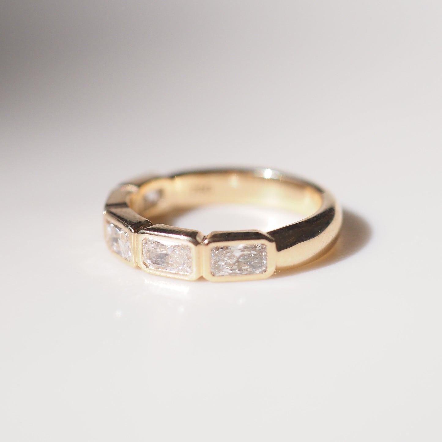This piece is created with five 5 x 3mm lab-grown radiant cut diamonds, splayed along a round gold band. The total carat weight is approximately 1.75ct.