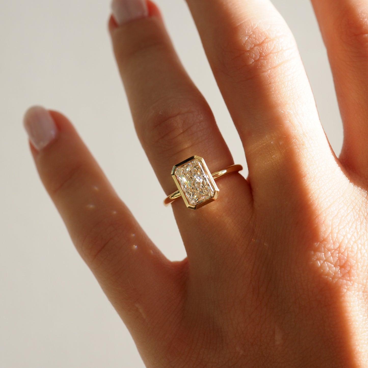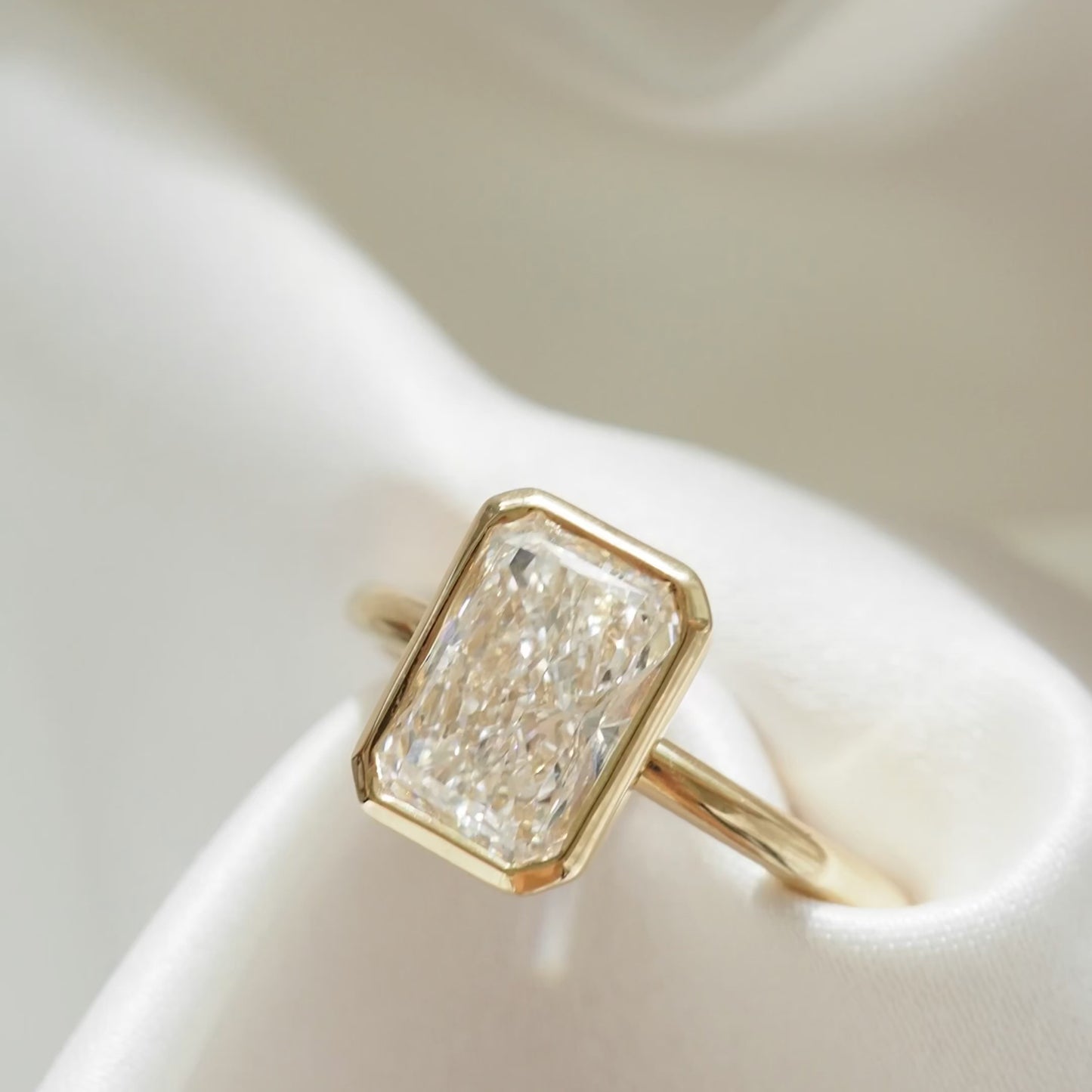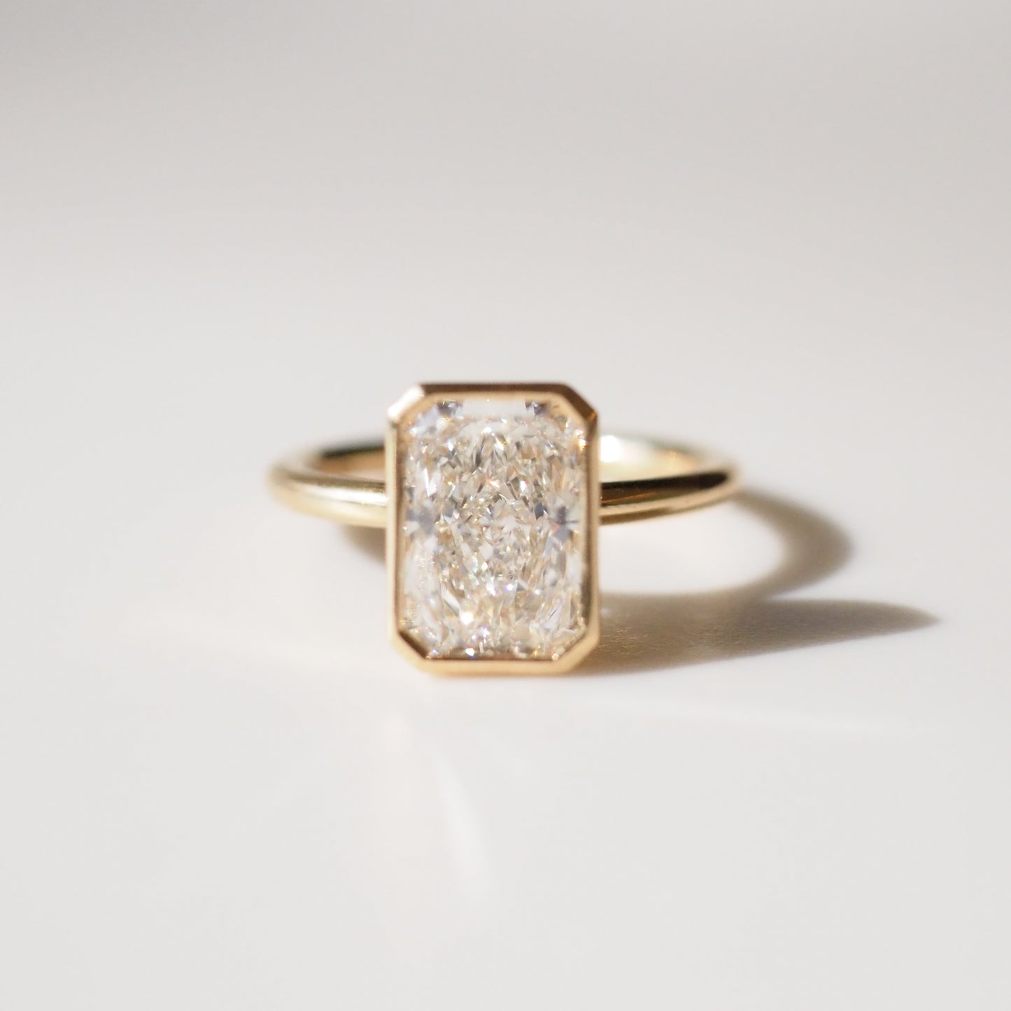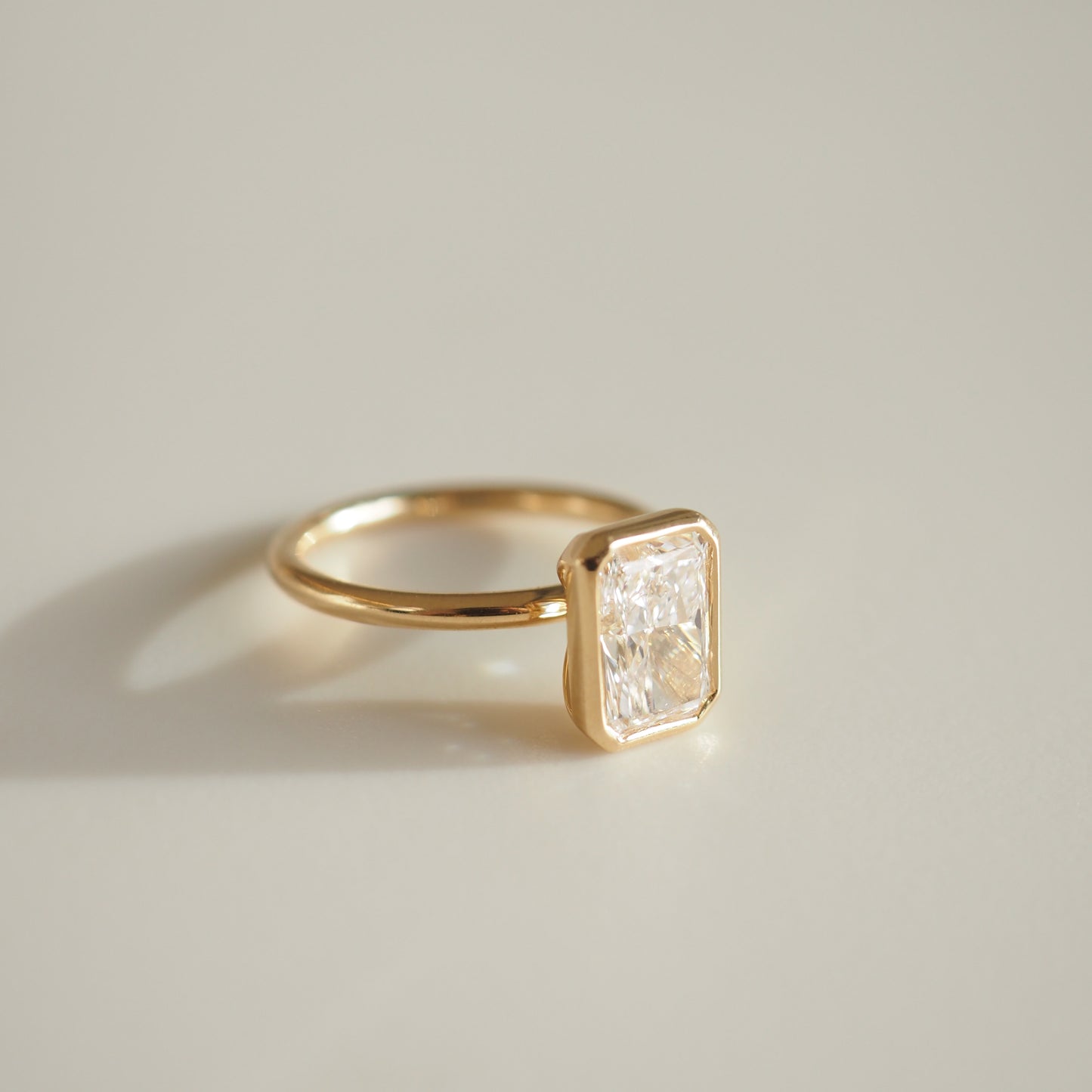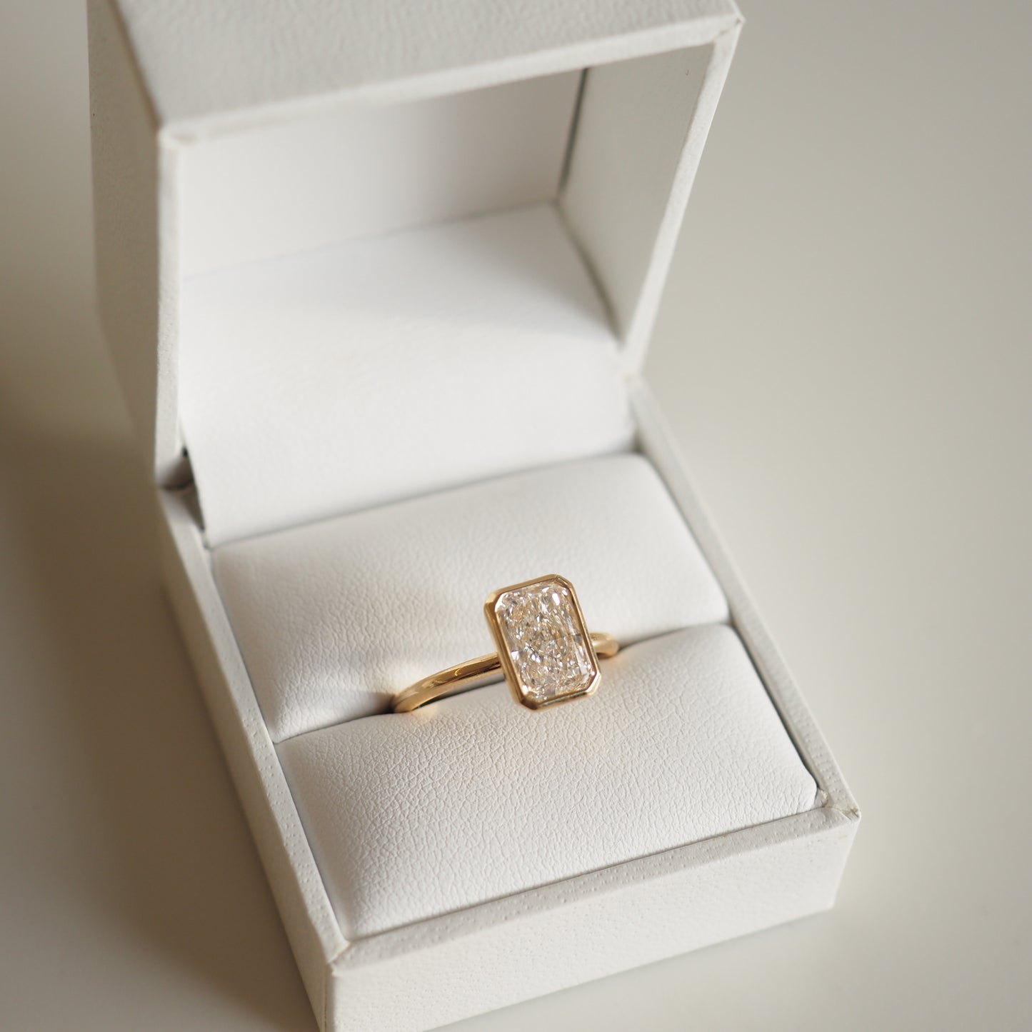 This ring showcases an elongated silhouette of a 2.08ct radiant cut lab-grown diamond — featuring our open bezel setting.